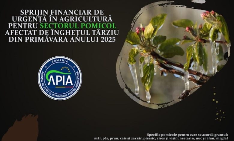 Agenția de Plăți și Intervenție pentru Agricultură (APIA) informează fermierii că, până la 9 martie 2026 inclusiv, pot fi depuse cereri pentru acordarea sprijinului financiar de urgență destinat sectorului pomicol, grav afectat de înghețul târziu de primăvară din perioada aprilie–mai 2025.